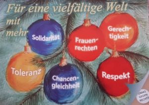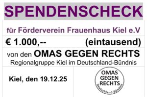 Wie immer um die Weihnachtszeit, unterstützen die OMAS GEGEN RECHTS ein Sozialprojekt. In diesem Jahr war es das Kieler Frauenhaus, das sich über eine Spende von 1.000 € und noch ein paar von Marion S. gepackte Wichtelpakete freuen konnte.