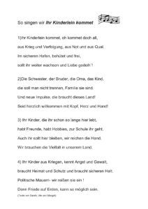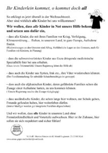 Ihr Kinderlein kommet – ein ernster, zutiefst menschlicher Wunsch, der weit über den sentimentalen Kitsch der „deutschen Weihnacht“ hinausgeht – und der Titel des Weihnachtsliedes, das die AG für die Mahnwache umgedichtet hat.